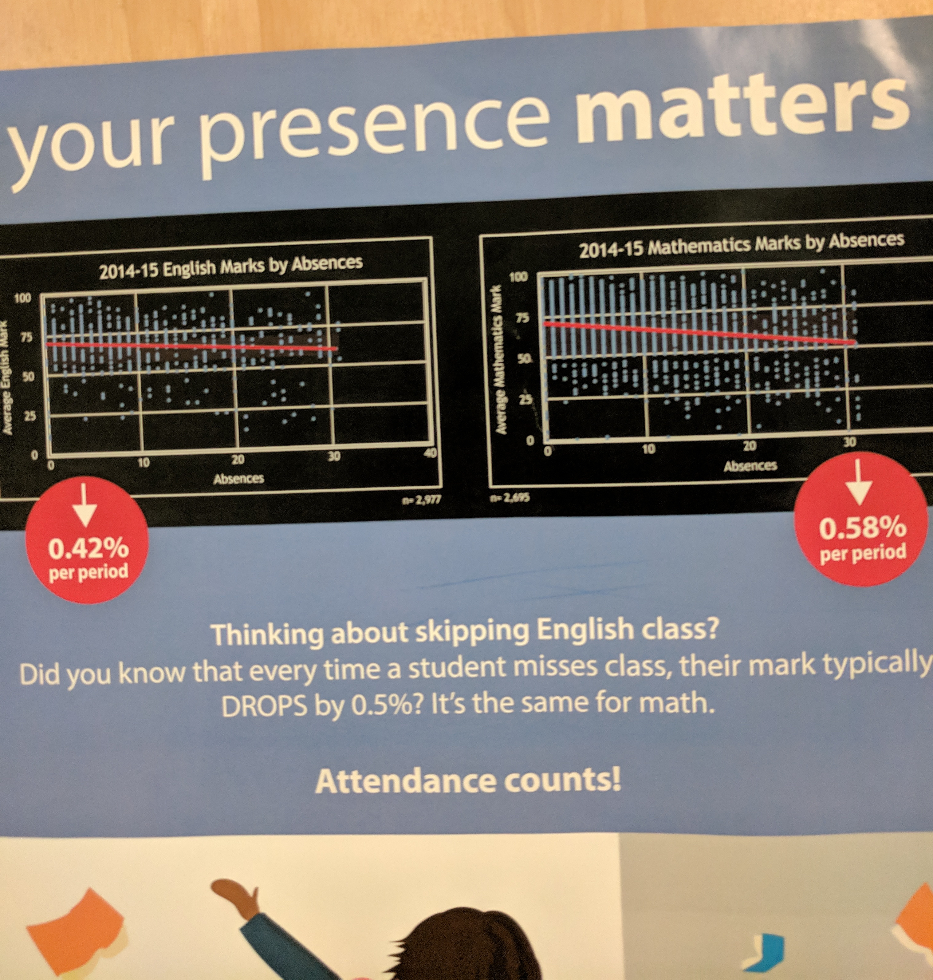 - Here’s a poster I saw at a high school I was visiting in 2019 about attendence at math class. Ironically it makes multiple statistical errors (e.g. assuming correlation=causation, having a trendline mostly influenced by a few outliers).